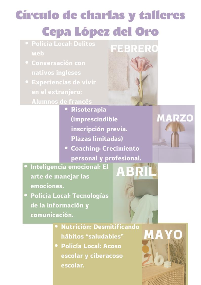 Os presentamos el circulo de charlas y talleres que se van a desarrollar en nuestro centro durante este segundo cuatrimestre, en el que trataremos todo tipo de aspectos realacionados con el bienestar físico y emocional. Las fechas y horarios concretos de cada actividad se publicarán independientemente cada mes en nuestras redes sociales y tablón físico del Cepa.